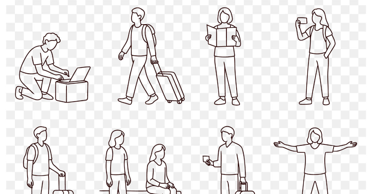 clean and modern black line art set featuring faceless, handless characters engaged in travel and exploration activities. Includes travelers with luggage, reading maps, taking photos, sitting in stations, holding passports, and expressing joy. Ideal for travel apps, itinerary planners, tourism websites, blogs, and commercial design kits. Perfect for vector conversion …