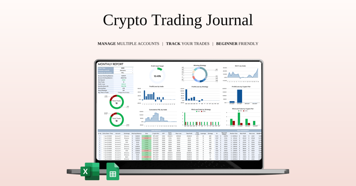 Crypto Trading Journal | Trading Dashboard | Trade Analysis Chart | Monthly Trading Report | Google Sheets | Excel All-in-One Crypto Trading Journal for Smarter Decisions This clean and easy-to-use spreadsheet is built to help crypto traders stay organized, analyze results, and grow with confidence. Track every trade in one …