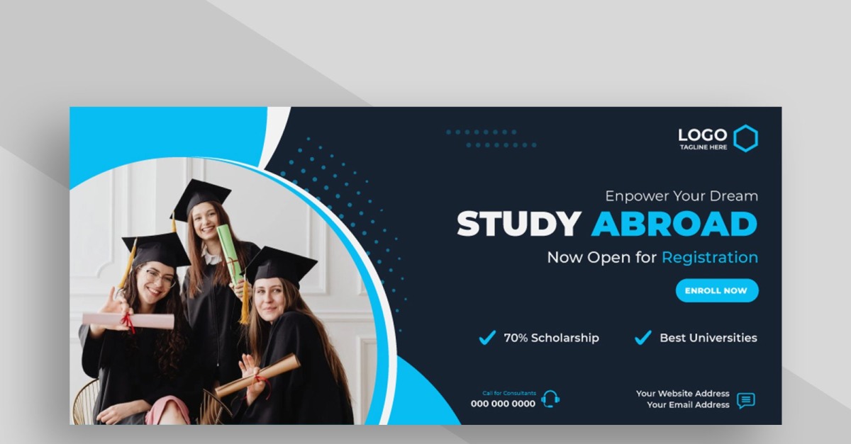 This Study Abroad Facebook Cover Banner Template is designed in Adobe Illustrator to give education consultancies, travel agencies, and institutions a modern way to promote their services. Featuring a clean layout, bold typography, and editable design elements, this template makes it easy to customize with your own colors, fonts, and …