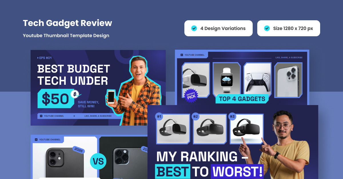 A bold and high-impact thumbnail layout designed for unboxing, comparisons, or “worth it” reviews. Includes neon outlines, VS layout, and room for dramatic expressions to grab attention fast. **Highlights:** – Thumbnail Size (1280×720 px) – 4 Design Variations – Fully Layered and Editable – Fully Customizable (text, color, & objects …