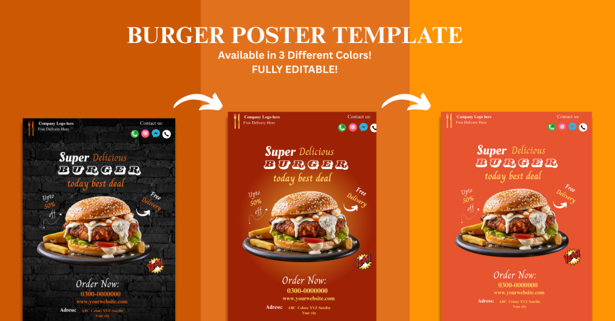 Boost your restaurant sales with this eye-catching burger deal poster! Perfect for cafes, burger joints, and fast-food restaurants, this Canva template makes it easy to promote today’s special offer, discounts, and limited-time deals. Features: Fully Editable in Canva: Change text, colors, fonts, and images effortlessly.Available in 3 Colors: Choose the …